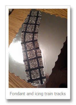 While you couldn’t see a lot of it in the finished product, I wanted to include a train track under the cake. Strips of black fondant with some cookies and cream sprinkles for the gravel worked really well.